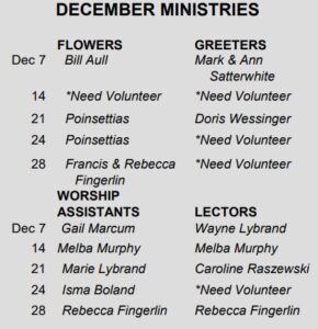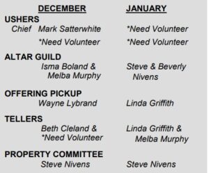 Altar Guild, Flower Offerings, Greeters, Hospitality Teams,  Lectors, Nursery Monitors, Offering Pick-Up, Property, Tellers, Ushers, Worship Assistants