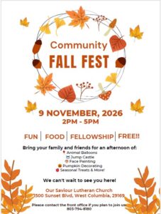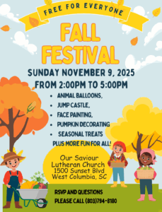 Fall Fest – Get ready for an afternoon of fun, fellowship, and festivities! Join us for a Fall Fest with games, activities, and, of course, food on Sunday, November 9, from 2-5 pm. Fall is one of those perfect times to bring folks together and celebrate the season! All are welcome!